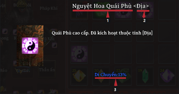 | Quái Phù | Tính chất: Chia làm 4 phẩm chất: Vi Quang - Tinh Thái - Nguyệt Hoa - Kim Ô |